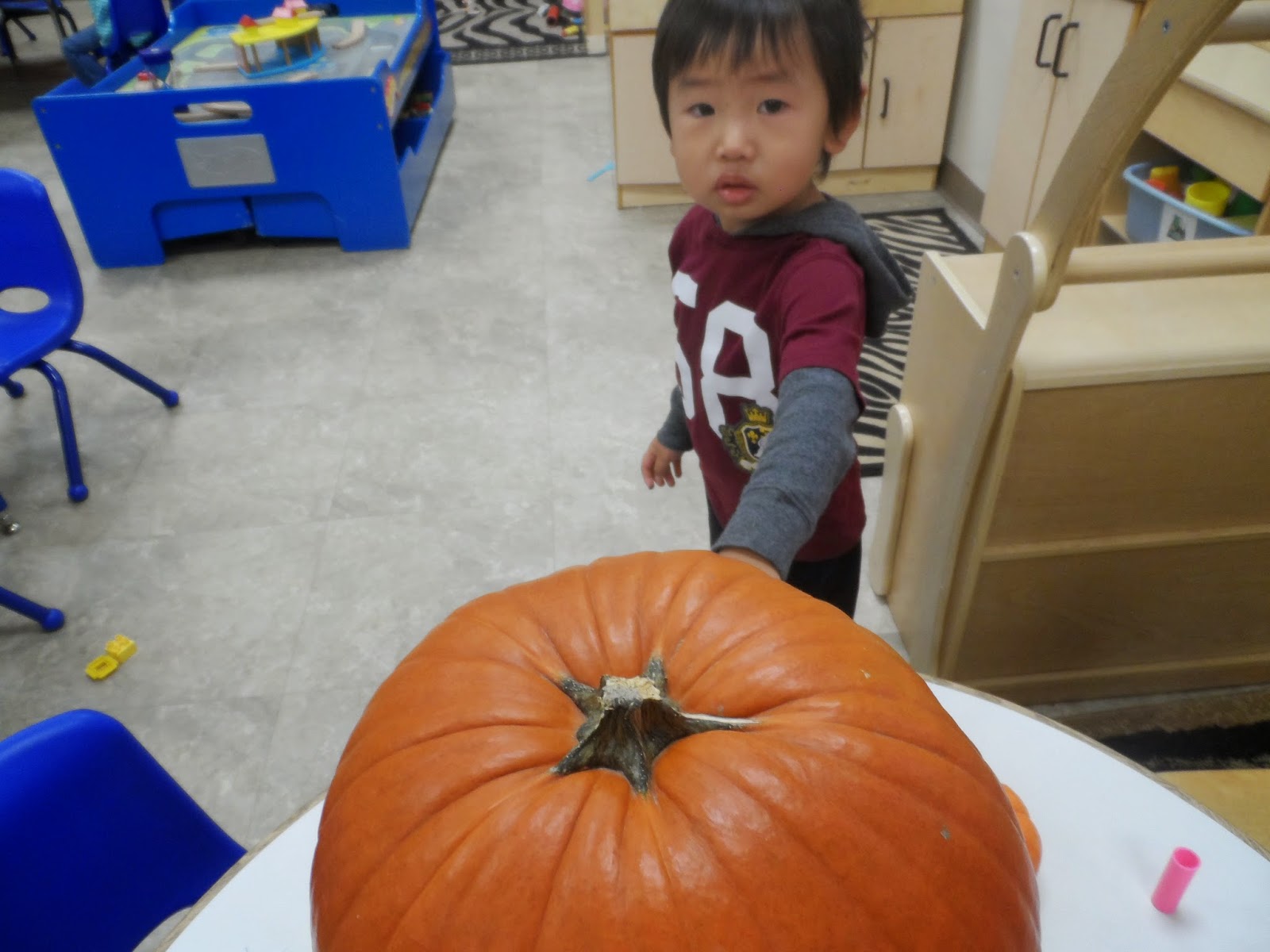 We used different words to describe how the pumpkin felt... squishy, cold, icky and mushy.